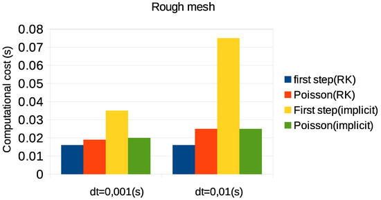 Figure 5 shows the computational times corresponding to the tests performed on the rough mesh. One can see that the costs of the solution of Poisson’s equation using both the proposed and the implicit schemes are nearly identical (around 0.02 s) for all considered time step sizes. The computational cost of the momentum equation solution equals 0.015 s in the case of the semi-explicit scheme and 0.035 s in the case of the implicit scheme for = 0.001 s. Increasing the time step to 0.01 s, the computational cost of the first step nearly does not change for the semi-explicit scheme, while it increases to 0.075 s in the case of the implicit scheme. This occurs due to the increased number of non-linear iterations necessary for the convergence of the implicit scheme.