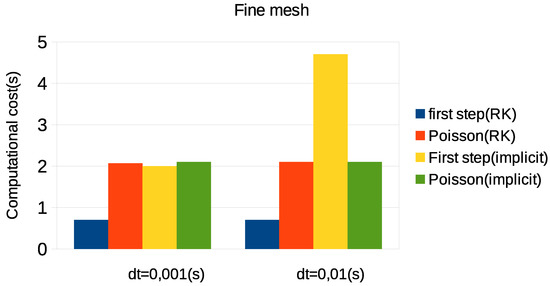 Figure 6 shows the computational times obtained in the simulation carried out on a fine mesh. Similar to the results shown in the previous figure, the time required for the solution of Poisson’s equation is similar in both methods, while there is a considerable difference in the time required for the solution of the fractional momentum equation (first step). One can see again that for larger time steps, several non-linear iterations are required in the case of the implicit scheme. In the considered case, for = 0.01 s, the overall computational cost of the implicit method is more than three-times larger than that of the semi-explicit scheme (the cost of the first step is more than five-times higher in the case of using the implicit scheme). We also note that Figure 4 indicates that for achieving a given accuracy, the semi-explicit scheme allows using much larger time steps. For instance, a relative error of approximately requires using 0.001 s in the case of the implicit scheme, while the semi-explicit scheme leads to this accuracy already for = 0.01 s. Thus, the overall computational cost corresponding to the time accuracy is much smaller in the case of using the semi-explicit scheme.