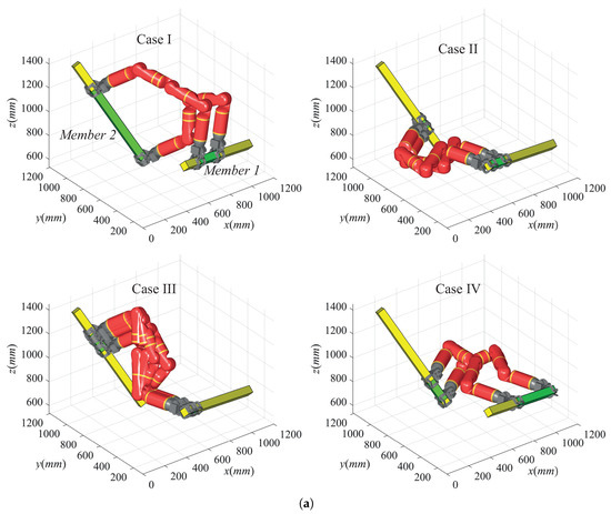 Figure 8 shows the simulation result of transition analysis. Without consideration of the accessibility of grips, there are four possible cases for transiting from Member 1 to Member 2, with different gripping orientations on the two members, respectively, as shown in Figure 8a. The operational regions are highlighted in green to distinguish them from the other parts of the member. Robots are displayed in specific configurations corresponding to the boundaries of operational regions. Taking the accessibility of grips into account, there remain only two possible cases for transition, as shown in Figure 8b. Moreover, the obtained operational regions in these two possible cases are narrowed down. Shortened parts, painted in red in Figure 8b, must be discarded, owing to corresponding grips being reachable but not accessible.