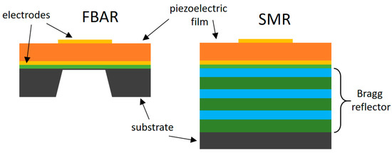 - Ruby, R. Review and Comparison of Bulk Acoustic Wave FBAR, SMR Technology. In Proceedings of the 2007 IEEE Ultrasonics Symposium, New York, NY, USA, 28–31 October 2007; pp. 1029–1040. [Google Scholar] [CrossRef]