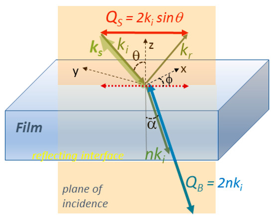 From the experimental point of view, the most simple and popular surf-BLS interaction geometry, suitable for thin films and opaque samples, is that represented in of Figure 2, called backscattering geometry, where the scattering angle and the same lens (typically a camera objective with f number comprised between 2 and 4 and focal length of 35 or 50 mm) is used for focusing the laser beam on the sample and for collecting the light that is back-scattered within a solid angle. A discussion of the influence of the f number of the collecting lens on the measurement accuracy can be found in Refs. [19,20]. Two classes of phonons contribute to the scattering in this geometry. First, through the conservation of the momentum component parallel to the surface, one can reveal acoustic waves propagating parallel to the free surface (“surface-like” waves) with an acoustic wavenumber QS = 2ki sin(θ) with ki = 2π/λ, with λ the optical wavelength (typically 514.5 or 532 nm) and θ the angle of incidence of light. Moreover, when the film thickness is much larger than the wavelength of light, “bulk-like” acoustic waves with wavevector QB = 2 nki enter the scattering process, with n the refractive index of the film. Due to optical refraction, these bulk waves propagate within the film material at an angle α = sin−1 (sin θ/n), as seen in Figure 2.