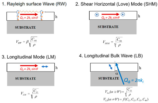 Let us now consider the latter (more complex) case that has been considered in previous investigations devoted, for instance, to ZnO [22] or AlN [23,24] films. Using different angles of incidence and a careful polarization analysis of the scattered light, one can detect and identify several guided acoustic modes [25], such as the surface Rayleigh wave (RW), the shear horizontal mode (SHM), the longitudinal mode (LM) and the longitudinal bulk (LB) mode, whose propagation direction and polarization are summarized in Figure 3. (Please note that in some papers the LM is labeled as LGM, longitudinal guided mode, and the LB is labeled as LA, longitudinal acoustic wave). Their detection provides a sufficiently large amount of information to estimate the whole set of independent elastic constants, because as summarized in Figure 3, measuring the frequency of the Brillouin peaks associated to the above mentioned modes provides access to the values of the five independent constants, namely C11, C13, C33, C44 and C66. In particular, one has the following selective relationship between the measured velocities and the elastic constants: , and with β, a constant that depends on the other elastic constants C11, C13, C33. It must be evaluated numerically, using the model of [25] and usually takes values in the range between about 0.9 and 0.95. The exact value of β can be found according to the following implicit expression derived by Dobrzynski and Maradudin [26]: