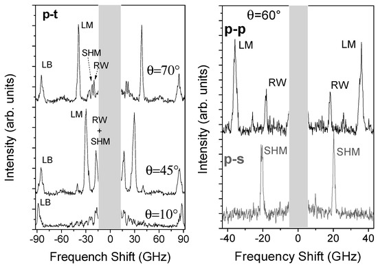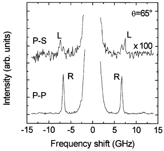 In any case, even if the polarization analysis of the detected light is not necessary, one should notice that the cross section of the RW and LM can be rather strongly dependent on both the value of the incidence angle and the polarization status of the incoming light. The RW whose cross section mainly relies on the rippling mechanism, can be efficiently detected using an incoming p-polarization and a relatively large angle of incidence (θ ≥ 50°) [31]. Instead, the cross section of the LM depends on the values of the photoelastic constants of the material under consideration. For instance, the cross section of the LM in dielectric glasses is much stronger using s-polarization (rather than p-polarization) of the incoming light at relatively small angles of incidence (30° < θ < 50°). This is clearly visible in the spectra reported in Figure 5, taken from Ref. [27].