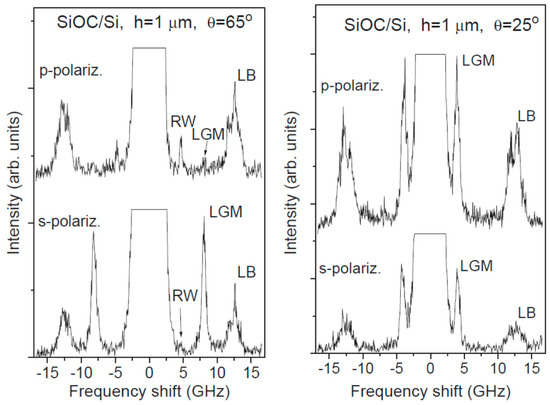 Experimental surf-BLS spectra relative to the SiOC:H/Si film, taken for an angle of incidence of light θ = 65° (left panel) and 25° (right panel). The upper spectra were taken using p-polarized incident light, while s-polarized light was used for the lower ones. The peaks corresponding to the Rayleigh surface wave (RW), to the longitudinal guided mode (LGM) and to longitudinal bulk wave (LB) are indicated on the anti-Stokes side of each spectrum. It can be seen that the RW peak has a large cross section for p-polarized incoming light and large angle of incidence. Instead, the LGM has a larger cross section for s-polarized light and small angle of incidence. Reprinted with permission from [27], Elsevier, 2005.