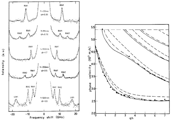 A relatively different situation occurs when the film thickness is submicrometric, i.e., comparable to, (or lower than) the acoustic wavelength. In the usual case of a film supported by a substrate, whose acoustic phase velocities are higher than those of the film (slow film/fast substrate), a number of discrete acoustic modes, namely the Rayleigh-Sezawa and Love modes are present [25] and can be revealed in Brillouin spectra. The former modes are polarized in the sagittal plane (i.e., in the plane of incidence of light, while the latter modes are polarized perpendicularly to the above plane). This transformation from a spectrum typical of thick films to the discretized spectrum typical of thin films is seen in the left panel of Figure 6, relative to GaSe films of different thickness [32]. Here, it is seen that the Rayleigh and a few Sezawa discrete modes are seen for film thickness of 77 and 251 nm. Taking measurements at different angles of incidence, one can obtain the dispersion curves shown in Figure 6, right panel.