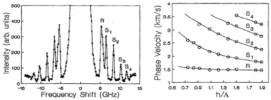 (Left) Brillouin spectrum taken on an Ag/Ni superlattice, 500 nm thick, having a periodicity of 2 nm, supported by a glass substrate. The Rayleigh and four Sezawa modes are seen. The incidence angle is 67°, which corresponds to a value of h/Λ = 1.8; (Right) Experimental (circles) and calculated (solid line) velocity dispersion of the Rayleigh and Sezawa modes for the same sample. Adapted with permission from [62], AIP Publishing, 1992.