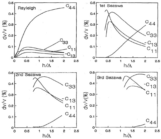 Relative changes of the phase velocity of the Rayleigh and first three Sezawa modes produced by a 1% increase of each elastic constant vs. the ratio between film thickness h and phonon wavelength. Calculations refer to an Ag/Ni superlattice film supported by a glass substrate. Reprinted with permission from [62], AIP Publishing, 1992.