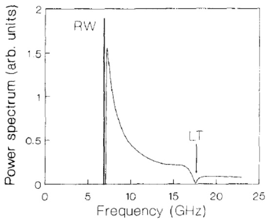 Calculated vertical component of the power spectrum of surface phonons, for a semi-infinite hexagonal medium (the phonon wavevector is fixed at 0.0226 nm−1). The vertical line represents the position of the Rayleigh wave (RW); the arrow indicates the dip corresponding to the longitudinal threshold (LT). Reprinted with permission from [66], Elsevier, 1992.