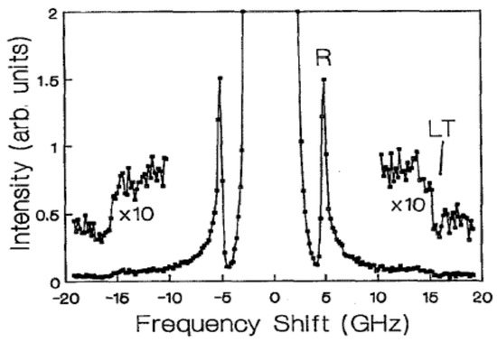 Brillouin spectrum from an unsupported Ag/Ni superlattice, 5 μm thick. Both the Rayleigh wave peak (R) and the dip corresponding to the longitudinal threshold (LT) are observable; the incidence angle is 67.5”, which corresponds to a value of h/Λ = 18. Reprinted with permission from [62], AIP Publishing, 1992.