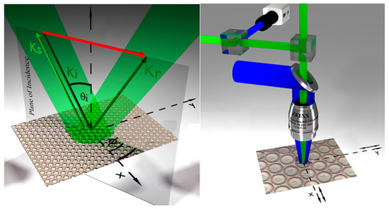 While the conventional surf-BLS technique, presented above, offers the possibility to measure the frequency of acoustic excitations with a well-defined wavenumber in a large frequency range (1–500 GHz), it has a poor lateral resolution, determined by the diameter of the laser spot, that is usually about 30–40 μm. Moreover, the signal is proportional to the intensity of the acoustic field, but it has no phase sensitivity. This means that in the case of inhomogeneous samples, such as artificially defined phononic crystals (PC) [71] or acoustic resonators [1,2,3,4], one cannot achieve the imaging of the spatial profile of the acoustic field. This limitation can be overcome using the recently developed micro-focused surf-BLS technique, whose schematic apparatus is drawn in Figure 14, that has been extensively used in the last decade to investigate the lateral localization of spin waves in ferromagnetic films and artificial magnonic crystals [72]. In fact, using a microscope objective with large numerical aperture, the laser light can be focused down to a diffraction-limited spot with a diameter below 300 nm and a submicrometric depth of focus. In addition, phase resolution can be achieved in the case of externally driven excitations, paving the way to the tridimensional mapping of magnetic or acoustic excitations by using surf-BLS as a scanning probe technique, in conjunction with an automated scanning stage for the sample. A coaxial viewing system based on a collimated LED light source (455 nm wavelength), a beam expander, and a CCD camera is used to obtain a direct visualization of the laser spot and of the sample region under investigation. Let’s notice that, although micro-focusing permits to achieve spatial and phase resolution, the wavevector sensitivity is lost, because of both the small dimension of the focused spot and the very large collection angle. Therefore, micro-focused surf-BLS is well suited to analyze the acoustic field driven by an external signal (as in acoustic resonators), rather than to detect thermally activated phonons. The application to these aim is initiated and preliminary results have been just presented [73]. Further progress will be achieved in the near future, also because the operating frequencies of devices are expected to increase above a few GHz, so the availability of a technique operating in the frequency domain (rather than in the time domain as done up to now [74,75]) can be advantageous.
