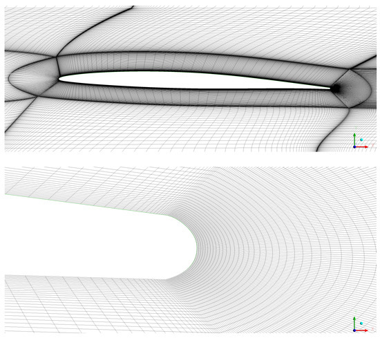 The angle of attack is set here to = 2 degrees. Freestream velocities of 34.36 m/s and 19.17 m/s are imposed as a boundary condition at the inlet, consistently with the experimental tests of Refs. [22,26]. An average static pressure condition of 101,325 Pa is imposed at the outlet. Periodic boundary conditions are applied on the top and on the bottom of the computational domain (see again Figure 1).