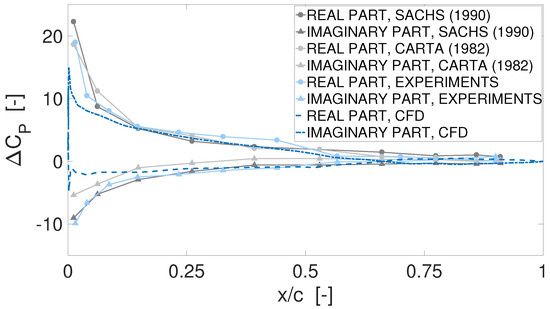 Figure 6 shows the results of time-resolved traveling wave mode simulations performed on the clean cascade and compared to the experimental counterpart, as well as to the measured data of Carta [23] and Sachs [24] on the same geometry. The comparison is performed for the blades oscillating at frequency of 5.25 Hz, corresponding to a reduced frequency —with the same inlet velocity used for the comparisons at constant angle of attack. The IBPA is equal to 0 degrees. The time step employed for the simulations is s, corresponding to 100 time steps per period. Three oscillation periods are simulated, in order to allow the flow to reach a fully developed periodic behaviour. Sensitivity studies to the time resolution and to the number of simulated periods—the latter shown in the following—have highlighted that these parameters give the best trade-off between accuracy and computational resources. Specifically, the real and imaginary parts of unsteady pressure are computed separately for the pressure and for the suction side of the central blade. The real part of the suction side is then subtracted to the counterpart of the pressure side, in order to get the displayed quantity . The same procedure is adopted for the imaginary part. The numerical results are found in good agreement with the experimental and literature data, in terms of both real and imaginary parts. Light differences are encountered just downstream of the leading edge, where, however, all the plotted data are remarkably scattered.