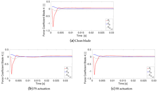Figure 7 shows the time history of the airloads obtained with time-resolved simulations at fixed angle of attack. These simulations are meant to show that the flow can be assumed as steady in the mean, when the blades are kept at a constant angle of attack. The time step for the unsteady computations is set to s and 100 time steps are performed for each period. It is found that all the three airloads converge to a constant value, after a maximum of ∼0.015 s. Therefore, steady state computations can be performed to assess the affection of plasma actuators on the force coefficients and on the flow field.