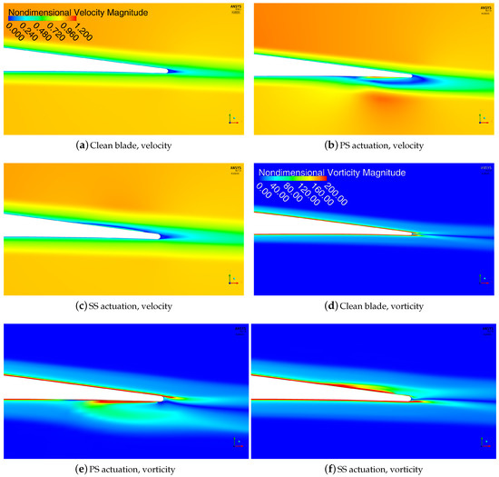 Figure 8 shows the normalized velocity and vorticity magnitude fields. The velocity is made dimensionless by the freestream velocity and the vorticity is made dimensionless by the ratio of chord over freestream velocity. A detail of the trailing edge is displayed for the clean blade and for the configurations with PS and SS actuation, respectively. A body force of 300 mN/m is applied on the pressure and on the suction side. Both actuations lead to the development of low speed recirculating flow areas, with a consequent modification of local and resulting loads. In particular, PS actuation yields a recirculating flow region on the pressure side trailing edge, in the area where the plasma is modeled. These locally developed vortical structures shift the application point of the Kutta condition downstream of the physical trailing edge. This is approximately equivalent to employing a longer and more cambered airfoil. Therefore, lift augmentations are expected to be a direct consequence of this phenomenon. The recirculating flow area generated by SS actuation causes an induced camber effect that is opposite relative to the SS counterpart. As a consequence, the resulting effect will be a reduction in the developed airloads. The flow fields of Figure 8 show that, as expected, the wake becomes thicker relative to the clean blade counterpart—the light blue low speed region is larger for the actuated configurations. This effect, which is consistent with the results of Refs. [18,19], may lead to possible drag increases compared to the baseline blade. Nevertheless, it will be hereinafter shown that no significant drag rises are encountered for both the actuated configurations. It is also worth noting that the recirculating flow area developed on the suction side is less extended, relative to the pressure side counterpart. This is probably due to the fact that higher velocity gradients are encountered on the suction side, near the trailing edge. Therefore, a larger body force is probably required on the suction side, in order to obtain almost equally extended recirculating flow areas on upper and on the lower side of the blade. It will be illustrated that a consistent asymmetry is encountered in terms of local and resulting airloads achieved with PS or SS actuation. On the basis of these results, the traveling wave mode simulations discussed in the following section are performed with a larger body force on the suction side and a smaller one on the pressure side.