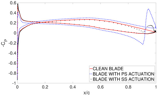 Figure 9 shows the pressure coefficient distribution for the clean blade, compared to the configuration with PS and SS actuation, respectively. Consistently with the results achieved in terms of flow field, PS actuation yields a clearly visible negative peak in the plasma region. The opposite occurs for the SS actuation. The most influential effect induced by the actuation can be seen by looking at the pressure distribution upstream the actuation, up to the leading edge. Indeed, SS actuation yields an overall modification of the pressure distribution, characterized by a covered area that is smaller compared to the clean configuration. This causes an overall attenuation of blade loading. The opposite occurs with PS actuation. This latter induces a modification of the pressure distribution, such that the area covered by the curve is significantly larger relative to the clean configuration. As a consequence, an increase in blade loading is expected. It is worth remarking that these results are in qualitative agreement with the assessments of Refs. [16,17,18,19,20], where the same effects were obtained with a mechanical L-tab deflected downward or upward, installed on a helicopter blade section. Additionally, the computed flow fields are qualitatively consistent with the Particle Image Velocimetry measurements of Feng et al. [21] on a low-speed fixed wing section with PS plasma actuation opposite to the freestream direction.