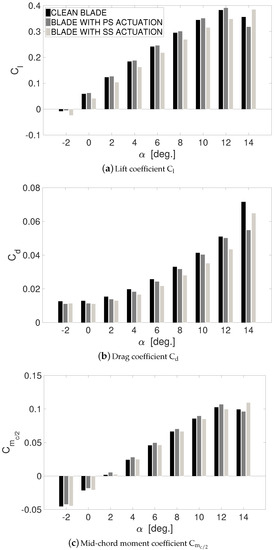 Figure 10 shows an histogram of the aerodynamic loads, computed on the clean, PS- and SS-actuated configurations, at angles of attack ranging from 0 to 12 degrees. Namely, the lift coefficient , the drag coefficient and the mid-chord moment coefficient are reported. As anticipated, actuation yields a modification of the effective camber, opposite for PS and SS plasma, alongside a chord-wise shift of the Kutta condition downstream of the trailing edge. Both PS and SS actuations provide lift and pitching moment modifications, which are also quantitatively comparable to those of Refs. [16,17,18,19,20], achieved with a mechanical Gurney flap. In particular, PS actuation allows for increasing the lift coefficient without changing the blade angle of attack, and with no significant drawbacks in terms of drag. The moment coefficient—nose-down positive—increases in magnitude, relative to the non-actuated counterpart. That is, PS actuation has a stabilizing effect on the mean airfoil torsion (see [46]). On the other hand, SS actuation yields effects that are comparable to those exhibited by upward deflections of control surfaces. Namely, lift is reduced compared to the clean configuration, with potential benefits in counteracting stall phenomena [19]. A reduction of the pitching moment, relative to the clean configuration, is observed. Again, no major effects are encountered in terms of drag rise. The affection of the actuation on the pitching moment is regarded as particularly important for this work. Within this framework, it is worth remarking that the behavior of pitching moment according to PS/SS actuation is consistent with the results of several works in literature, dealing with mechanical trailing edge control surfaces, e.g., Refs. [19,47,48]. Additionally, the light reductions of drag coefficient relative to the clean blade—encountered with both pressure and SS actuation—are in agreement with other results found in literature on trailing edge devices (see e.g., Refs. [16,17,18,19,20,49]). It is also worth remarking that the present fully-turbulent RANS assessments can’t provide a quantitative evaluation of drag. The results presented here are meant to give only a qualitative overview on the affection of plasma on this quantity.