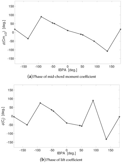 Phase of mid-chord moment coefficient and of lift coefficient at different IBPAs; Re ∼195,000; degrees; Hz, .