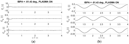 Figure 12 shows the time history of lift, drag and moment coefficient on the central blade of the plasma-equipped cascade at IBPA = −51.43 degrees. In this case, four oscillation periods are simulated. Figure 12a depicts the four simulated periods, whereas Figure 12b is a blowing up on the second, third and fourth simulated periods, where the reaching of a well-established period regime can be better detected. Specifically, the transient results are deemed quasi-converged when the force coefficient relative difference between two consecutive periods falls below 0.02%. This condition must be achieved for all the force coefficients considered, i.e., lift, drag and moment. It is found that the difference in lift, drag and moment coefficient falls below the fixed threshold already between the second and the third oscillation period. Notice that also Keerthi et al. [2], who performed numerical computations on a cascade with pitching blades, found that their numerical solution reaches a good periodicity after two periods of oscillation. Namely, three oscillating cycles are simulated for small amplitude oscillations and four oscillating cycles for high amplitude oscillations are simulated in [2].