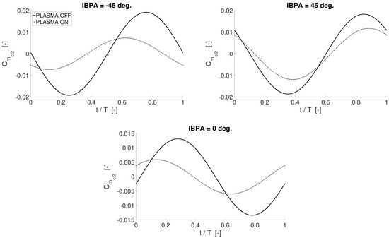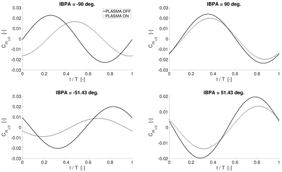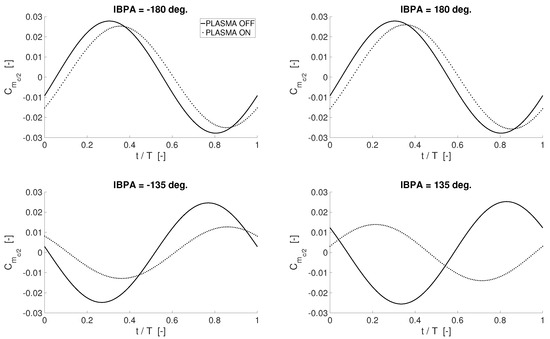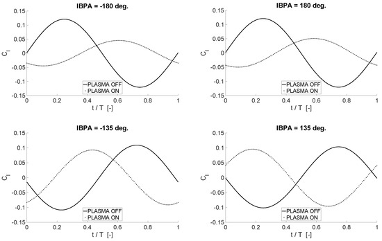 The unsteady lift curves are shown in Figure 17 for IBPA = [−180, −135, 135, 180] degrees. Overall, the lift coefficient is found to be less affected by actuation, compared to the moment, though the reduction in amplitude provided by the actuation is clearly visible. This discrepancy with respect to the moment coefficient is somehow expected because the phase of the lift coefficient for a pitching airfoil is different from the moment coefficient counterpart, consistently with Figure 11 and with Refs. [50,51]. Moreover, it is worth recalling that vibratory loads associated to the bending mode are expected to be less influential for fatigue phenomena—as well as for the aerostructural stability—of the targeted cascade compared to vibratory loads in pitch (see again Refs. [22,26]). The computed drag coefficient is not reported for brevity purposes. Indeed, the main concern of this work is to show the effect of plasma actuators on unsteady moment coefficient. Computations at constant angle of attack have shown that no significant drag rises have to be expected when employing plasma actuators. Additionally, as already mentioned, an accurate evaluation of plasma effects on the drag coefficient would require anyway more detailed and much more computationally demanding numerical simulations, which lie beyond the purposes of the present work. The assumption of fully turbulent flow, together with the numerical filtering associated with the Reynolds averaging operation, allows for getting only the qualitative behaviour of the drag.