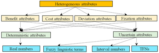 The technique for order preference by similarity to an ideal solution (TOPSIS) [4] is widely utilized to solve MADM problems, due to its advantages of simple calculation, reasonable evaluation results, and flexibility in application compared with other MADM methods [5,6,7,8,9]. The basic principle of TOPSIS is that the optimal solution to a MADM problem should have the shortest distance from the positive ideal solution (PIS), and the farthest distance from the negative ideal solution (NIS), and that the distance can be measured by the Euclidean distance [10]. Scholars have conducted a great deal of research on the development of TOPSIS for solving various MADM problems in recent years. Fan et al. [11] proposed a new method for dealing with stochastic MADM problems based on the ideal and anti-ideal cumulative distribution functions. Kaveh et al. [12] transformed the multi-objective decision making (MODM) problem into a bi-objective one based on TOPSIS, and proposed an integrated multi-objective framework to solve MODM problems including both tangible and intangible factors based on the extended efficient epsilon-constraint method. Sharma and Singhal [13] applied fuzzy TOPSIS to the selection of the best procedural approach for solving facility layout-planning problems. Ye and Li [14] proposed an extended fuzzy TOPSIS by utilizing possibility theory to deal with MADM problems with fuzzy numbers. Baykasoğlu and Gölcük [15] proposed a hybrid MADM method for modelling complex decision-making problems by integrating fuzzy TOPSIS and fuzzy cognitive maps. Xu and Zhang [16] developed a new MADM approach by integrating the TOPSIS and maximizing deviation methods, in which the evaluation information provided by the decision-maker is described as hesitant fuzzy elements, and the information about attribute weights is incomplete. Maldonado-Macías et al. [17] proposed an intuitionistic fuzzy TOPSIS for evaluating advanced manufacturing technology considering ergonomic compatibility attributes, and applied it to the selection of numerically controlled milling machines. Arabzad et al. [18] evaluated suppliers according to the criteria arising from strengths, weaknesses, opportunities and threats analysis in the MADM of suppliers, and solved the resulting MADM problem by fuzzy TOPSIS. Wang and Chen [19] proposed a novel method by integrating the interval-valued intuitionistic fuzzy (IVIF) sets, linear programming, and TOPSIS to solve MADM problems in IVIF environments. All of the above approaches were proposed to solve MADM problems with attributes in uniform mathematical descriptions.
