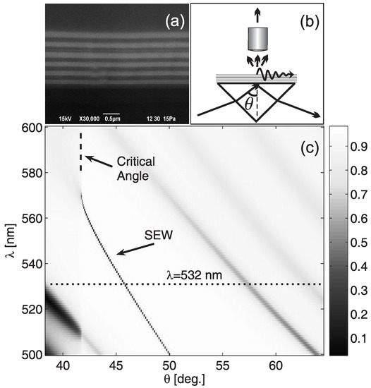 (a) Typical SEM image of one-dimensional photonic crystal, consisting of 6 SiO/TaO bilayers at the quartz substrate (from bottom to top); (b) Schematic of the Kretschmann configuration for the Bloch surface waves (BSW) coupling and detection; (c) Calculated normalized reflectivity map R() of the 1D photonic crystal illuminated in the Kretschmann configuration. Darker regions indicate lower reflectance. BSW dispersion curve is indicated by the arrow and SEW acronym. Reprinted with permission from I.V. Soboleva, E. Descrovi, L. Dominici, F. Michelotti, F. Giorgis, A.A. Fedyanin, Proceedings of SPIE 7356, 73560E (2009) [23].