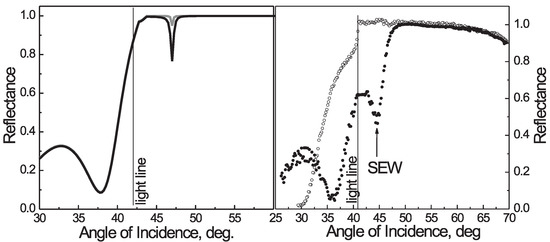 The dispersion law of BSWs lies behind the air light line [24]. This is clearly seen, for example, in Figure 1c presenting calculated spectral–angular dependence of reflectance response of the considered photonic crystal. The BSW resonance appears as the narrow dip in reflectance and the BSW dispersion curve is shown as a dark line located inside the first photonic band gap beyond the critical angle. As soon as the BSW dispersion curve approaches the critical angle for which the total internal reflection occurs, it becomes wider until it disappears. As in the case of the SPP, the BSW requires special excitation schemes. Prism schemes of the attenuated total internal reflection in the Otto or Kretschmann geometry, or schemes based on matching the wave-vector lengths of the BSW and the incident light by means of a diffraction grating, can be used. The prism scheme in the Kretschmann geometry is shown in Figure 1b. A sample of a photonic crystal is attached to a 45-degree BK7-glass prism using an immersion fluid that ensures the matching of the refractive indices of materials of the prism and the substrate of the photonic crystal. The light is brought into the prism at an angle of incidence . In the case of the synchronism condition , where , are the wave vectors of the BSW and light in air, respectively, and is the refractive index of the prism, the BSW is excited on the surface of the photonic crystal and air boundary. The excitation can be detected either by the spectra or angular dependences of the reflectance, or by the BSW scattering on the surface roughness. A typical dependence of the reflectance of a photonic crystal on the angle of incidence in the Kretschmann geometry is shown in the Figure 2.
