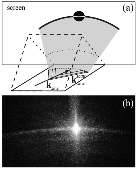 Since the BSWs are surface waves, the surface roughness has a significant effect on their propagation. This effect is well known for the SPPs [27]. Depending on the degree of roughness, its presence leads to an increase in the angular width and a decrease in depth of the surface wave resonance, as well as to rescattering the wave both in the propagation plane and out of it. In the case of the BSW, this can also be observed [28]. Scattering of the BSW in the propagation plane leads to a deflection of the BSW from the original propagation direction and to the appearance of a set of wave vectors of scattered waves fanning away from the original direction (Figure 4a).