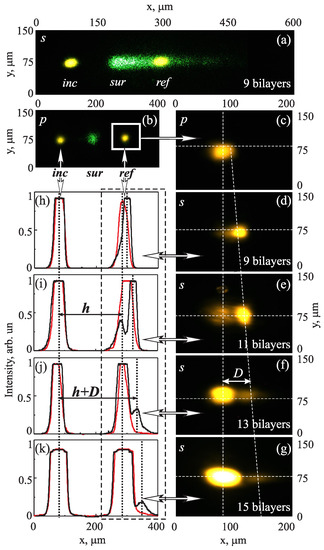 Microimages of the surface of the photonic crystal illuminated with s- (a) and p-polarized (b) light; The objective lens is focused on the photonic crystal surface; (c) Fluorescence microimage of the reflected p-polarized beam. The objective is focused in the immersion liquid layer; (d–g) Fluorescence microimages of the s-polarized beam reflected from photonic crystals with different numbers of bilayers. The Goos–Hänchen shift is marked as D; (h–k) Fluorescence intensity profiles of s- (black line) and p-polarized (red line) beams. Left and right peaks correspond to incident (inc) and reflected (ref) spots. Reprinted with permission from I.V. Soboleva, V.V. Moskalenko, A.A. Fedyanin, Phys. Rev. Lett. 108, 123901 (2012). Copyright (2012) by the American Physical Society [26].