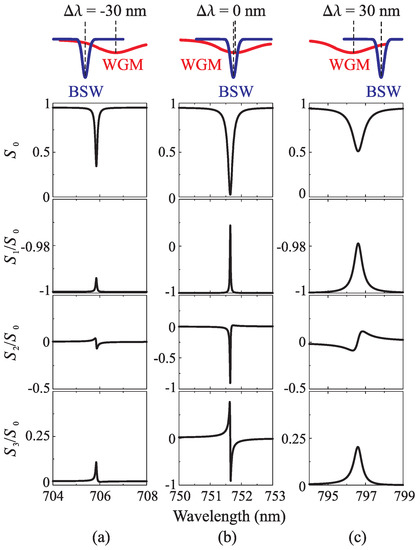 Besides the Faraday rotation, Ref. [53] also considers other transformations of light polarization, such as transition of the linear polarization to the elliptical one. To describe these polarization changes, the spectral dependencies of Stokes parameters were numerically studied. Obtained Stokes parameter spectra are shown in Figure 8. Three typical cases were considered. In the first case, the position of the BSW resonance is blue-shifted for 30 nm relative to the resonance of the WGM (Figure 8a). In the second case, the position of the BSW resonance is shifted 30 nm to the higher wavelengths (Figure 8c). The third case corresponds to the situation when the BSW and WGM have the same spectral position (Figure 8b). The parameter is the reflectance of light from the sample. The angle of Faraday rotation can be achieved from the first and second Stokes parameters as . The Stokes parameter corresponds to the ellipticity of reflected light. The shapes of spectra and show that Faraday rotation of reflected light becomes higher while the BSW coupling is more effective. The reflected light ellipticity increases simultaneously (Figure 8, spectrum). When the WGM and BSW have the same wavelength of excitation, the ellipticity equals 1, so the reflected light is circularly polarized. While the BSW coupling becomes less effective, the values of Stokes parameters significantly decrease (Figure 8a,c). The influence of the WGM and its spectral position relative to the BSW manifest themselves in the spectral behavior of the parameter . If the BSW excites at shorter wavelength than the WGM, the spectrum has the shape of an asymmetric Fano resonance (Figure 8a). For the BSW excited at a longer wavelength than the WGM, the Fano resonance in the spectrum takes an inverted asymmetric shape (Figure 8c). Therefore, the Faraday rotation angle changes sign when the dispersion curves of the BSW and WGM resonances intersect each other. In fact, the polarization of light can be controlled by a magnetic field applied to the MPC structures supporting the excitation of the BSW. Due to the excitation of the BSW, studied MPC structures have a great potential for applications as a magnetically-controlled wave-plate of variable thickness.