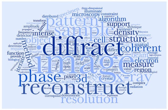 Word cloud of synchrotron-based coherent diffraction imaging published research papers. About 50 widely-read published papers were downloaded. These papers are published during the last 18 years since the first coherent diffraction imaging experiment was conducted successfully in 1999. The main text of the papers was analyzed by open python codes. The frequency of each meaningful word was calculated and then demonstrated by different size and colors. The bigger the size means the larger the frequency. The image shows that reconstruction, sample, phase and resolution are the most used terms for the past 18 years of coherent diffraction imaging research. At the same time, structure, intensity and radiation have also been key topics for biological imaging since 1999. (Original datas were collected from References [24,31,32,38,42,43,44,45,46,47,48,49,50,51,52,53,54,55,56,57,58,59,60,61,62,63,64,65,66,67,68,69,70,71,72,73,74,75,76,77,78,79,80,81,82,83,84,85,86,87]. Figure was generated under the help of Github open codes [89].).