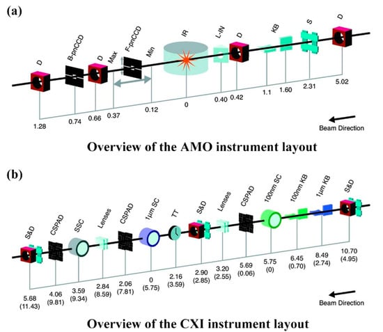 Overview of Atomic, Molecular & Optical Science (AMO) and Coherent X-ray Imaging (CXI) instrument layout. Distances are indicated in meters from the interaction region (IR) for AMO, 1 μm sample chamber (SC) and in parentheses from the 100 nm SC for CXI. The X-ray beam enters the hutch and passes through the diagnostics (D) and slits (S) and is then focused by KB mirrors. (a) An optical laser in-coupling (L-IN) is located 0.4m upstream of the IR. Two pairs of pnCCD detectors are located in different positions downstream of the IR; (b) For the CXI instrument, each chamber is colored to match its designed KB mirrors. A timing tool (TT) is designed to obtain the fine time between X-ray laser and pump laser. (Figures were reproduced from Reference [145,146] with permission from International Union of Crystallography/IUCr).