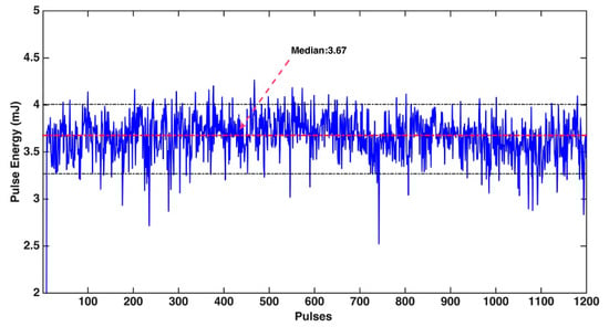 Pulse energy fluctuation with time. The intensity and position fluctuations come from the origin of SASE. The common fluctuations are typically 10% but sometimes as high as 30%.