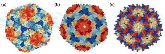 Projections of bioparticles used for SPI experiments. (a) Biological assembly of double-shelled rice dwarf virus (RDV). RDV is a member of the genus Phytoreovirus in the family Reoviridae. The atomic structure was determined by X-ray crystallography at 3.5 Å resolution [166]; (b) Quasi-atomic structure resolution model of bacteriophage PRD1 wild type virion. PR772 belongs to the PRD1 family. The dsDNA bacteriophage has a membrane inside its icosahedral capsid. The atomic structure was determined by combined cryo-EM and X-ray crystallography at 25 Å resolution [169]; (c) Crystal structures of MS2 coat protein mutants in complex with wild-type RNA operator fragments. MS2 is a group I RNA bacteriophage that infects Escherichia coli. The atomic structure was resolved by X-ray crystallography at a resolution of 2.8 Å [170]. The projections were generated by NSL Viewer, a WebGL based 3D viewer [171,172].