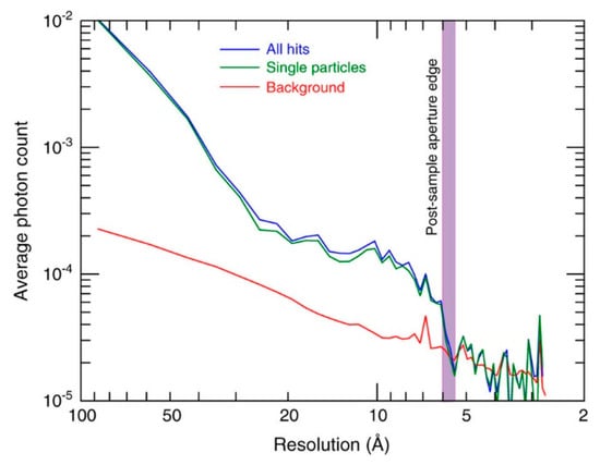 Radial average of signals using hard X-rays. Elevated photon counts from the sample are visible up to an angle commensurate with 5.9 Å resolution, this being the resolution limit set by the angular acceptance of a post-sample aperture. (reproduced with permission from [180]. Copyright Springer Nature, 2016).
