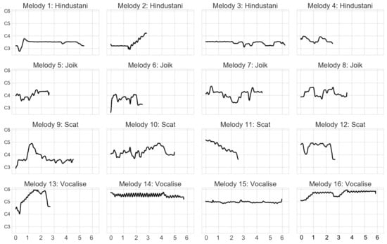 The final stimulus set consists of four different musical genres and four stimuli for each genre. The musical genres selected are: (1) Hindustani (North Indian) music, (2) Sami joik, (3) scat singing, (4) Western classical vocalize. The melodic fragments are phrases taken from real recordings, to retain melodies within their original musical context. As can be seen in the pitch plots in Figure 1, the melodies are of varying durations with an average of 4.5 s (SD = 1.5 s). The Hindustani and joik phrases are sung by male vocalists, whereas the scat and vocalize phrases are sung by female vocalists. This is represented in the pitch range of each phrase as seen in Figure 1. The Hindustani and joik melodies are mainly sung in a strong chest voice in this stimulus set. Scat vocals are sung with a transition voice from chest to head. The Vocalizes in this set are sung by a soprano, predominantly in the head register. Hindustani and vocalize samples have one dominant vowel that is used throughout the phrase. The Scat singing examples use traditional ‘shoobi-doo-wop’ syllables, and joik examples in this set predominantly contain syllables such as ‘la-la-lo’.