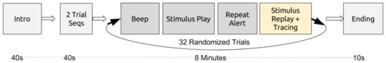 The sounds were played at a comfortable listening level through a Genelec 8020 speaker, placed 3 m in front of the subjects. Each session consisted of an introduction, two example sequences, 32 trials and a conclusion, as sketched in Figure 2. Each melody was played twice with a 2-s pause in between. During the first presentation, the participants were asked to listen to the stimuli, while during the second presentation, they were asked to trace the melody. A long beep indicated the first presentation of a stimulus, while a short beep indicated the repetition of a stimuli. All the instructions and required guidelines were recorded and played back through the speaker to not interrupt the flow of the experiment.