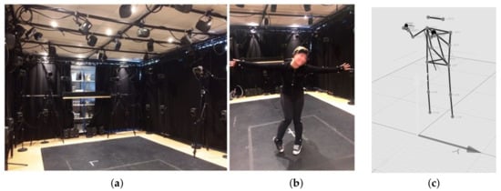 (a) The motion capture lab used for the experiments. (b) The subjects wore a motion capture suit with 21 reflective markers. (c) Screenshot of a stick-figure after post-processing in Qualisys Track Manager software (QTM).