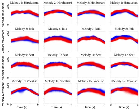 Average contours plotted from the vertical motion capture data in mm (z-axis) for each of the melodies (red for the original and blue for the re-synthesized versions of the melodies). The x-axis represents normalized time, and the y-axis represents aggregated tracing height for all participants.