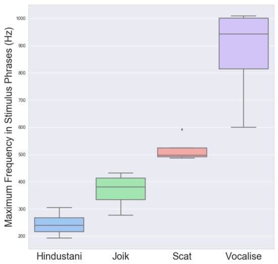 A total of 32 subjects (17 female, 15 male) was recruited, with a mean age of 31 years (SD = 9 years). The participants were mainly university students and employees, both with and without musical training. Their musical experience was quantized using the OMSI (Ollen Musical Sophistication Index) questionnaire [], and they were also asked about the familiarity with the musical genres, and their experience with dancing. The mean of the OMSI score was 694 (SD = 292), indicating that the general musical proficiency in this dataset was on the higher side. The average familiarity with Western classical music was 4.03 out of a possible 5 points, 3.25 for jazz music, 1.87 with joik, and 1.71 with Indian classical music. Thus, two genres (vocalize and scat) were more familiar than the two others (Hindustani and joik). All participants provided their written consent for inclusion before they participated in the study, and they were free to withdraw during the experiment. The study obtained ethical approval from the Norwegian Centre for Research Data (NSD), with the project code 49258 (approved on 22 August 2016).