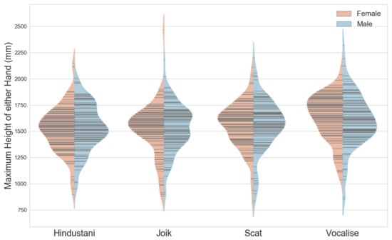 Plots of the maximum height of either hand for each genre. The left/pink distributions are from female subjects, while the right/blue distributions are from the male subjects. Each half of each section of the violin plot represents the probability distribution of the samples. The black lines represent each individual data point.