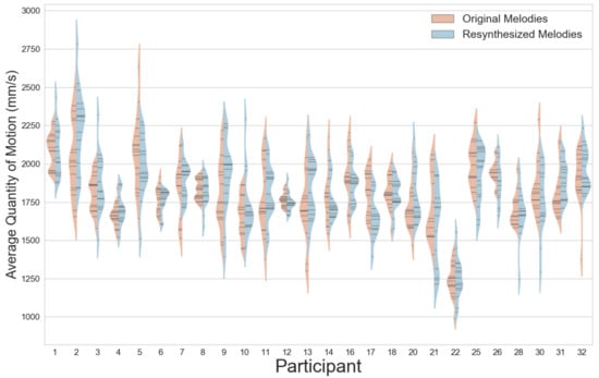 Plots of the distributions of the quantitiy of motion (QoM) for each subject for all stimuli show a large degree of variation (Figure 7). Subjects 4 and 12, for example, have very small diversity in the average QoM for all of their tracings, whereas Subjects 2 and 5 show a large spread. There are also other participants, such as 22, who move very little on average for all their tracings. Out of the two types of representations (original and re-synthesized stimuli), we see that there is in general a larger diversity of movement for the regular melodies as opposed to the synthesized ones. However, the statistical difference between synthesized and original melodies was not significant.
