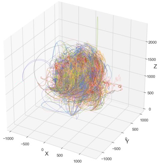 A three-dimensional plot of all sound-tracings for all participants reveal a fairly constrained tracing volume, a kind of ‘social box’ defined by the subjects. Each color represents the tracings of a single participant, and numbers along each axis are milimetres.