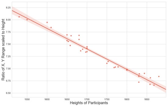 Regression plot of the heights of the participants against scaled (x, y) ranges. There is a clearly decreasing trend for the scaled range of movements in the horizontal plane. The taller a participant, the lower is their scaled range.