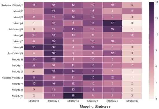 In Figure 12, we visualize the use of these hand strategies for every melody by all the participants. Strategy 2 is used in 206 tracings, whereas Strategy 5 is used for only 8 tracings. Strategies 1, 3, 4 and 5 are used 182, 180, 161 and 57 times, respectively. Through this heat map in 12, we also can find some outliers for the strategies that are more infrequently used. For example, we see that Melodies 4, 13 and 16 show specially dominant use of some hand strategies.