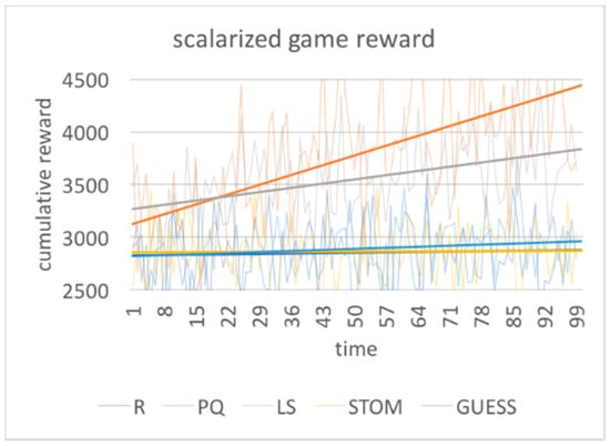 This section contains the implementation and discussion of an experiment comparing Pareto based MORL to three different scalarization approaches. The Pareto-Q-learning implementation, developed by Sun et al. in [], was shown to be superior to a basic Q-learning implementation. The implementation had two major drawbacks: (1) calculating Pareto fronts is an inefficient process (see the complexity analysis); and (2) the algorithm used linear scalarization when selecting an action (see the Multi-Objective Reinforcement Learning section).