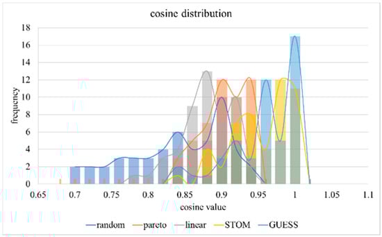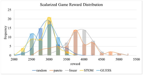The cosine results, however, show that Pareto-Q-learning and linear scalarization achieve this high cumulative result by ignoring the defender’s desired goal prioritization. The STOM and GUESS approaches meanwhile result in a goal distribution which is close to the optimum. The GUESS distribution is statistically not different from the desired goal prioritization. The standard t-test confirms this with GUESS t-statistic of 0.057, being the only one to exceed the p-value of 0.05. It is noteworthy that the STOM method led to a ratio that was still close to the desired goal prioritization, while the other approaches were nowhere near the distribution.