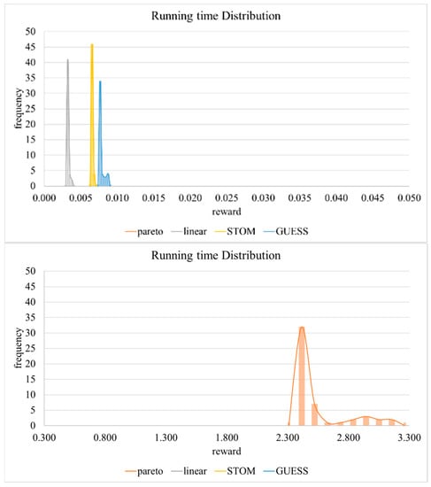 We tested the algorithm efficiency by recording the running time of just the optimization algorithm for each of 50 starting network conditions. The resulting time for 2000 operations is listed in Table 3. Figure 9 shows the distribution of the running times. It is clear from the results that the Pareto-Q-learning is the most inefficient approach. By contrast, linear scalarization is the most efficient and runs 760 times faster than Pareto-Q-learning approach and two times faster than the other two scalarization approaches. Of the two algorithms in the middle, the STOM approach performs significantly better than the GUESS approach. These results confirm our assumption that the scalarization approaches outperform the Pareto-Q-Learning approach.