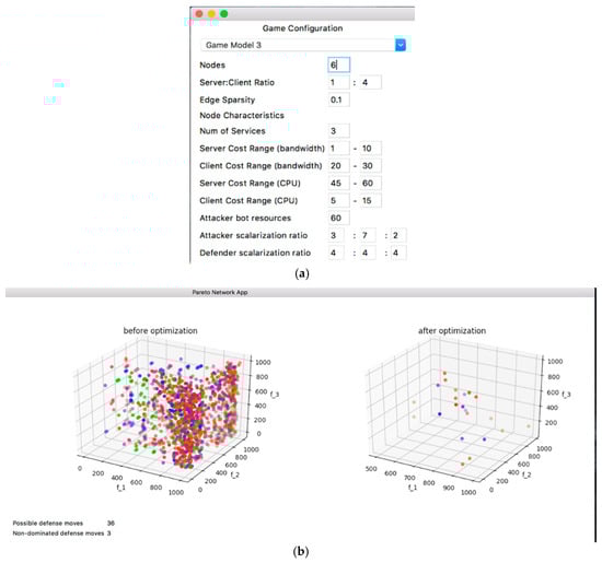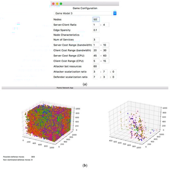 The PDSS system overview is shown in Figure 11, which is under the configuration of Table 6, and the user can select the regular network graph definition features: the number of nodes and server-client ratio. The user can select the model specific graph definition features: edge sparsity and cost ranges for bandwidth and CPU resources. The user can select the model features: attack resources and the scalarization ratios for the attacker and defender. The number of possible strategies is determined by the model. This model has a 3-D solution space.