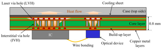 To assure the proposed AOC has high heat-dissipation efficiency, the structure of the thermal vias was designed and optimized. Figure 3 shows the cross-sectional view of the thermal vias in a multi-layer substrate. The multi-layer substrate consists of eight organic layers with a total thickness of 0.8 mm. Laser via holes (LVHs) and interstitial via holes (IVHs) are located in the build-up layers (with thickness of 0.05 mm/layer) and the core substrate (with thickness of 0.5 mm), respectively. The LVHs are fabricated by laser-beam machining and filled with copper. The IVHs are fabricated by drilling, and their side walls are formed by copper plating and filled with resin. In addition, a thermal sheet is used to fill in the gap between the substrate and the case. By applying and optimizing this heat-dissipation structure, heat directly and efficiently dissipates to the topside of the case through the thermal vias as shown in Figure 3. Therefore, the proposed AOC allows the optical devices to operate higher temperate.