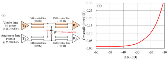 (a) Simulation model for crosstalk analysis and (b) Calculation result of crosstalk jitter. PRBS, pseudo-random binary sequence.